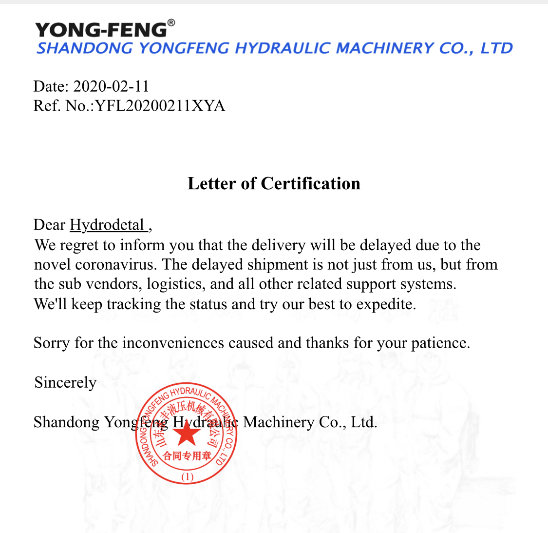 尊敬的客戶:我們很遺憾地通知您,由于新型冠狀病毒的防疫工作,永豐液壓交貨將延遲。延遲發(fā)貨的原因不僅僅來(lái)自我們,還來(lái)自分供應(yīng)商、物流和所有其他相關(guān)支持系統(tǒng)。我們會(huì)繼續(xù)追蹤情況,盡力加快速度。給您帶來(lái)的不便敬請(qǐng)諒解,謝謝您的耐心。…
