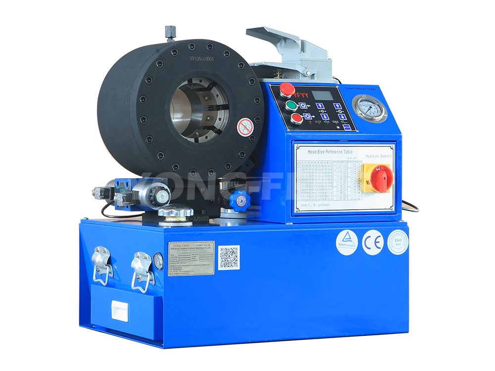 從液壓油管扣壓參數(shù)表中查得Ф19mm四層鋼絲膠管接頭外套外徑扣壓前為37mm,扣壓后為33.5mm,應(yīng)選用的模具內(nèi)徑為Ф33mm,對應(yīng)千分尺刻度為3。安裝好Ф33mm模具于模座上,并將千分尺刻度旋至3處,將膠管剝皮后與接頭組裝好??蹓和戤吅鬁y量接頭外套外徑就是扣壓參數(shù)表的扣壓后數(shù)值33.5mm,則完成扣壓。如扣壓后外徑不符,微調(diào)千分尺后扣壓下一根膠管??蹓耗z管接頭時(shí):扣壓尺寸過多,膠管內(nèi)膠層被壓斷,造成漏油;扣壓尺寸太少,造成漏油和被油壓沖脫接頭。務(wù)必掌握合理扣壓度,以接頭芯子內(nèi)孔收縮度為準(zhǔn),國標(biāo)接頭受壓縮小0.1~0.4mm,普通接頭受壓縮小0.1~2mm。因膠管及接頭外套的生產(chǎn)廠家不同,如北方大多數(shù)膠管生產(chǎn)廠用GB標(biāo)準(zhǔn),南方用602標(biāo)準(zhǔn),國外SAE標(biāo)準(zhǔn),各廠膠管、接頭的具體尺寸、材質(zhì)可能不盡相同,因此扣壓參數(shù)表數(shù)據(jù)僅供參考,具體扣壓尺寸應(yīng)以壓力實(shí)驗(yàn)為依據(jù)。